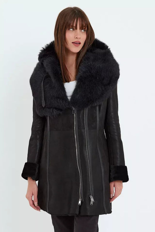 Arctic Noir Women's Black Shearling Coat with Toscana Fur Hood for Ultimate Style and Comfort